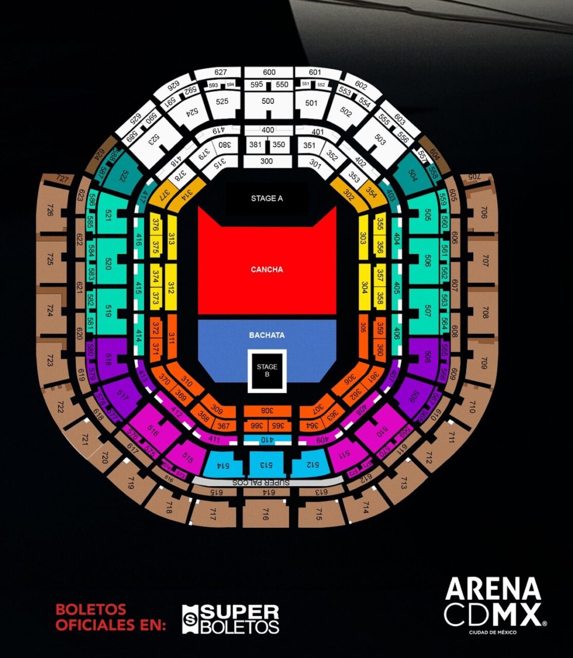 | Zona | Cancha VIP, Bachata, Amarillo, Amarillo vista limitada, Naranja, Super Palco, Super Palco vista limitada, PCD, Celeste, Rosa, Morado, Aqua, Aqua vista limitada, Café, Café vista limitada |